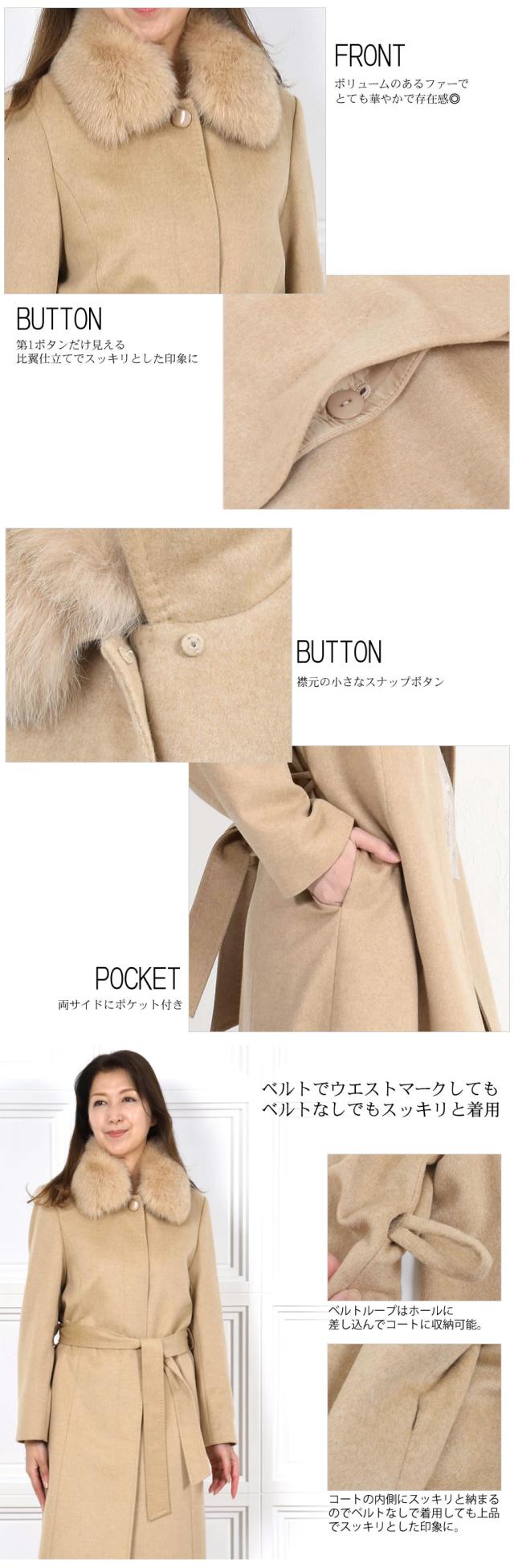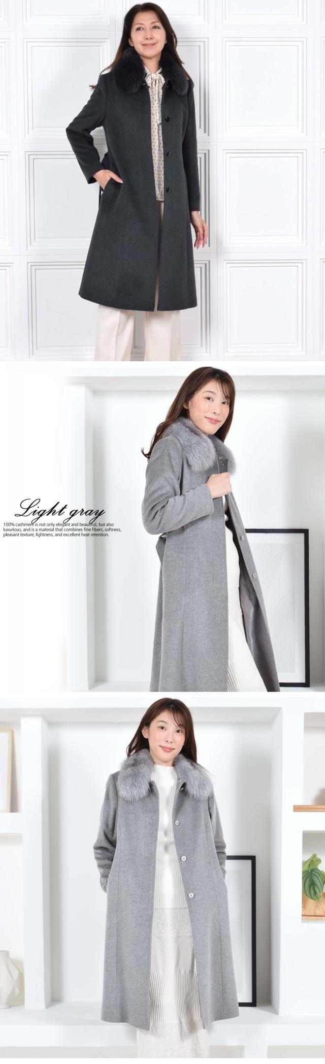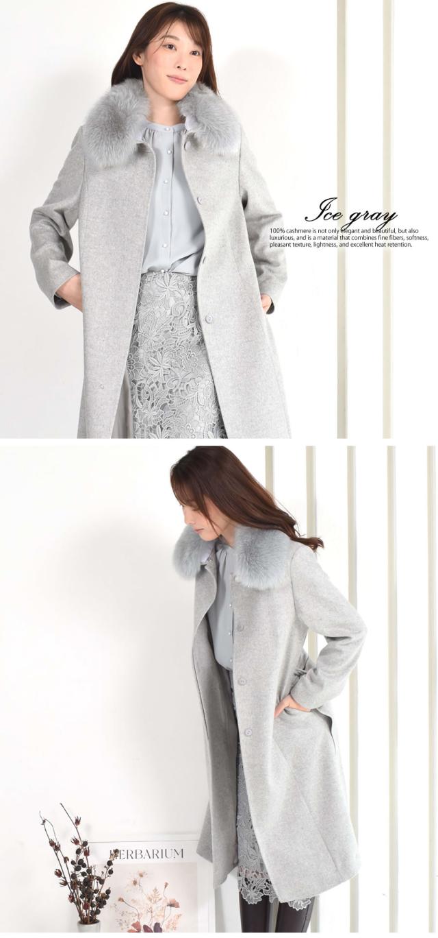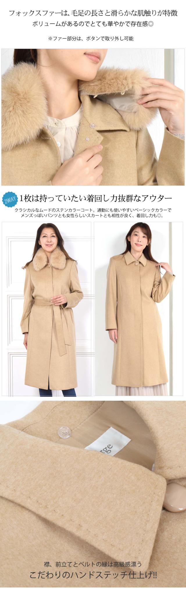 「繊維の宝石」と呼ばれるカシミヤ。上質な素材が放つ艶感は、やはり格別。着心地もラグジュアリー感も本物を知る大人の女性のための洗練されたカシミヤ100%コート。カシミヤ100%は上品な美しさや高級感もさることながら、繊維の細かさ、柔らかさ風合いの良さ、軽さ、そして優れた保温性などをあわせもった素材です。フォックスファーは毛足の長さと滑らかな肌触りが特徴。ボリュームがあるのでとても華やかで存在感があります。ベルトを締めることで縦長効果も◎ファーを取外すとすっきりとしたステンカラーコートに。通勤スタイルや普段使い、フォーマルスタイルなどコーディネートの幅が広がります。