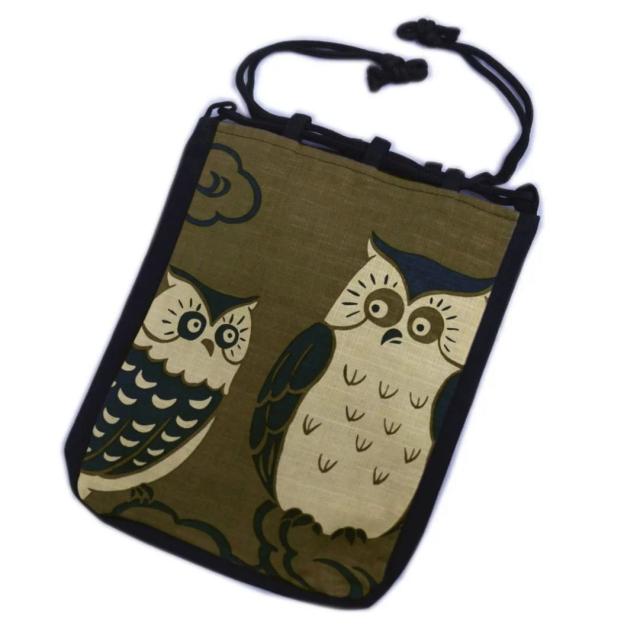 信玄袋 巾着 バッグ メンズ 男性 カーキ茶色地ふくろう 日本製 浴衣 甚平 着物 男物 紳士用 粋 和柄 開運亭 女性用