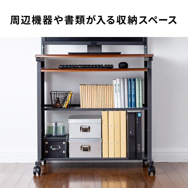 ⇒ご購入の前にご確認下さいデスクトップパソコンと一緒に、液晶ディスプレイ(液晶モニター)やプリンター等の周辺機器をまとめて設置できる。キーボード設置用のキーボードテーブル、プリンターを置ける上棚、移動しやすいキャスターなどを備えたパソコンラック。重厚なダークオーク木目柄。【WEB限定商品】