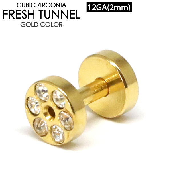 【メール便対応】フレッシュトンネル ゴールド ラインストーン付 12G(2mm) GOLD カラーコーティング加工 ボディーピアス ゴージャス ロブ アイレット イヤーレット 12ゲージ┃