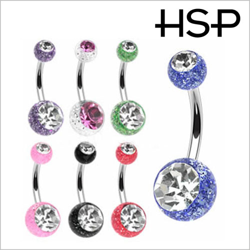 キラキラのラメ入りグリッターボールにジュエルをセットした可愛いヘソピアス(バナナバーベル)。