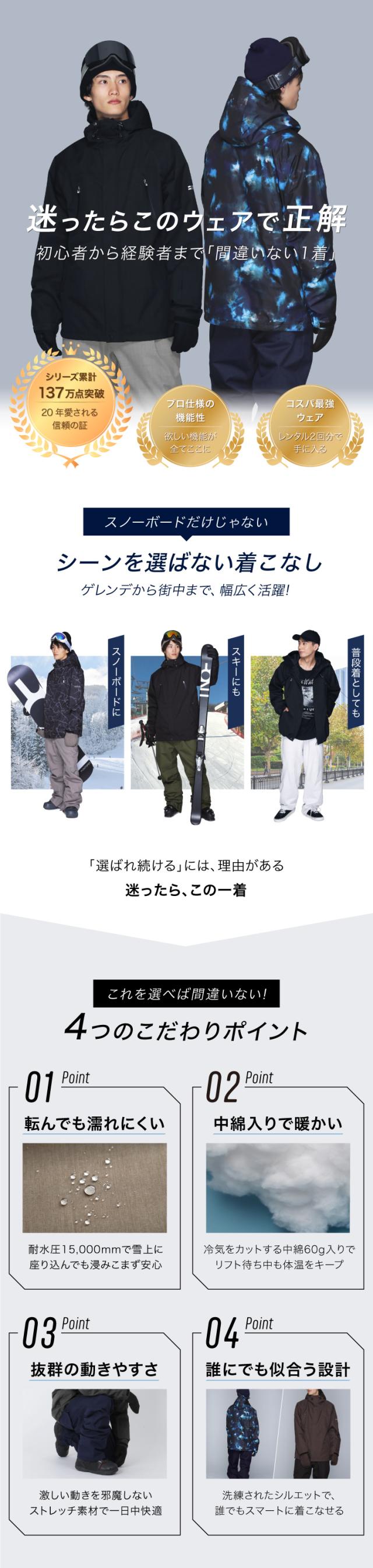 スキー・スノーボードウェアとしての機能は充分ついていながら中綿ありで暖かく女性でも男性でも抵抗なく着られるシンプルデザインです。スポーツウェアならではの動きやすい設計で普段着や雪の中のアウトドア、アクティビティにもおススメ!耐水・撥水で止水ジップもついているので雪はもちろん冷たい雨もしっかり防ぎます。
