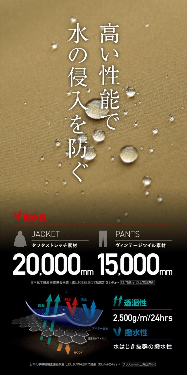 ・驚異の耐水・撥水力!高い耐水性能で雨雪などの水の侵入を防ぐ