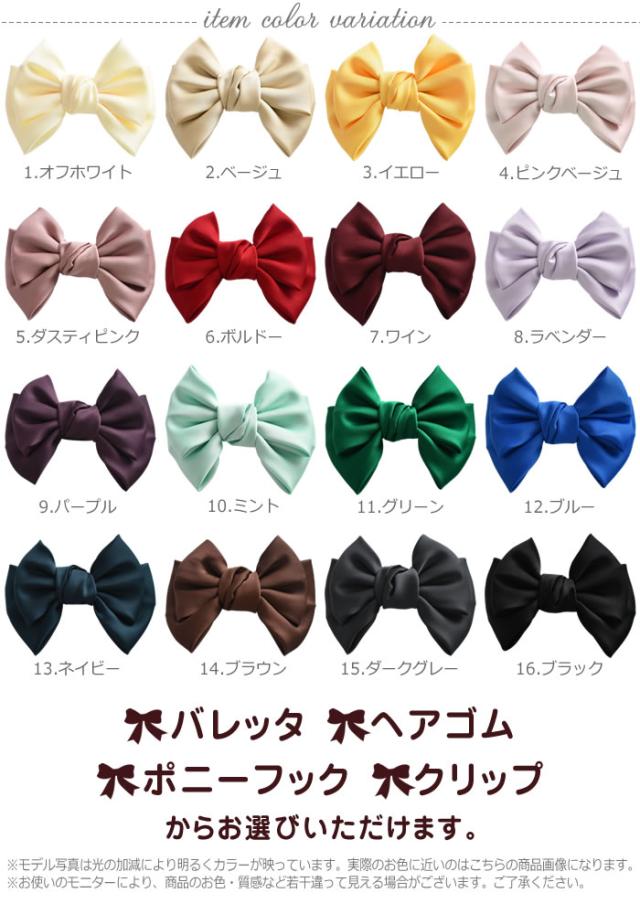 | 商品説明 | 艶のあるサテン素材がエレガンスで大人ガーリーにぴったりなバレッタ&ヘアゴム&ポニーフック&クリップです。柔らかな生地のリボンなので、まとめ髪のヘアゴムも見えなくなります。1年中使えるデザインで、手のひらサイズのリボンだからオンオフに使えて便利!高級感のあるサテン素材なので、柔らかく手触りも抜群!ヘアアレンジが苦手な方でもサッとまとめ髪が出来るので、1つあると便利。ギフトにも大人気のアイテムです♪発表会や、結婚式、二次会、パーティー、卒業式、卒園式、入学式、入園式にも大活躍してくれます。 |