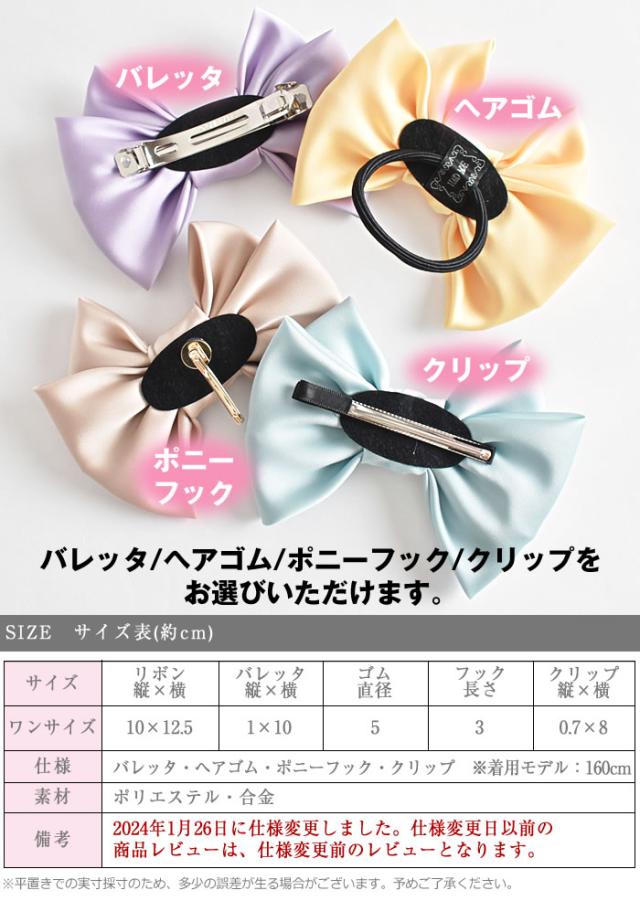 | サイズ | (約)リボンサイズ:縦10cm・横12.5cm バレッタサイズ:縦1cm・横10cm ゴムサイズ:直径5cm クリップサイズ:縦0.7cm・横8cm フックサイズ:長さ3cm |