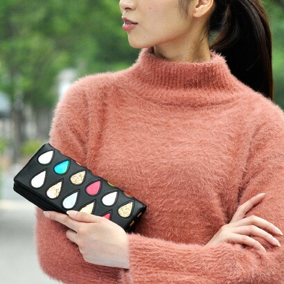 | キラキラと存在感抜群のカラフルドロップデザインが女性心をわし掴み!レザーのふっくらした触り心地が手にフィットする、テレビでも紹介されたキュートな長財布です♪ 簡単に開け閉め出来るホック開閉を採用。内側もカラフルでお買い物が楽しくなる事間違いなし!小銭入れとは別に小物の小分け収納に便利なファスナーポケットも装備◎ 可愛さをグッとUPさせるカラーごとに異なるドロップ型チャームもポイント♪ |