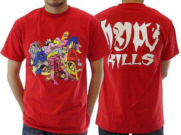 フロントプリントはアメリカアニメらしいタッチのキャラクターがカラフルに描かれています。バックプリントには『KILLS』の文字がおどおどしく描かれています。全体的にポップカラーリングでインパクト大なので個性的なスタイリングを好む方、ストリートの視線を集めたい方にオススメです!!