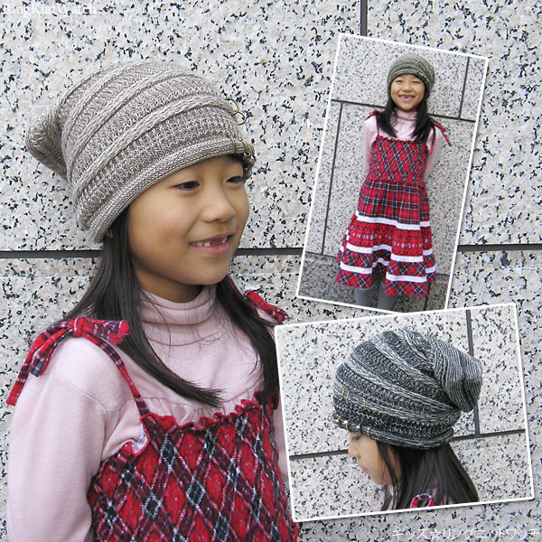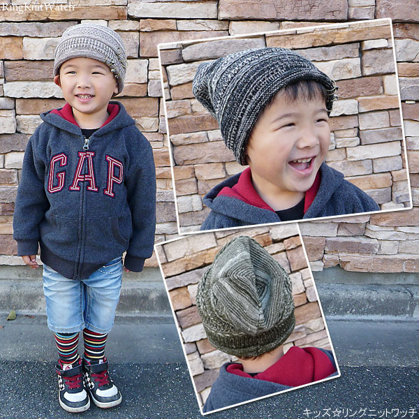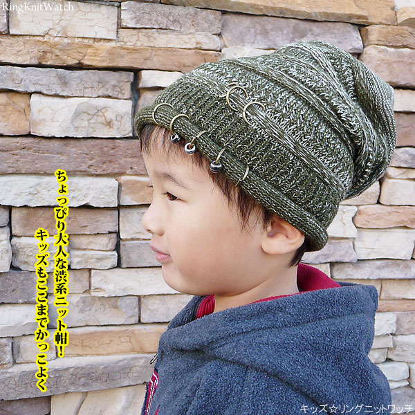 驚きのクールさを映し出すニットキャップのご紹介です。はじめに言っておきます。これ、子供さん用です(笑)とってもかっこいいデザインで、ボディについたリングピアスはもう本格的!!ロールアップタイプで被りやすく、MIXな色使いも極渋系!ちょっぴり大人なハイセンス系ニットキャップです。