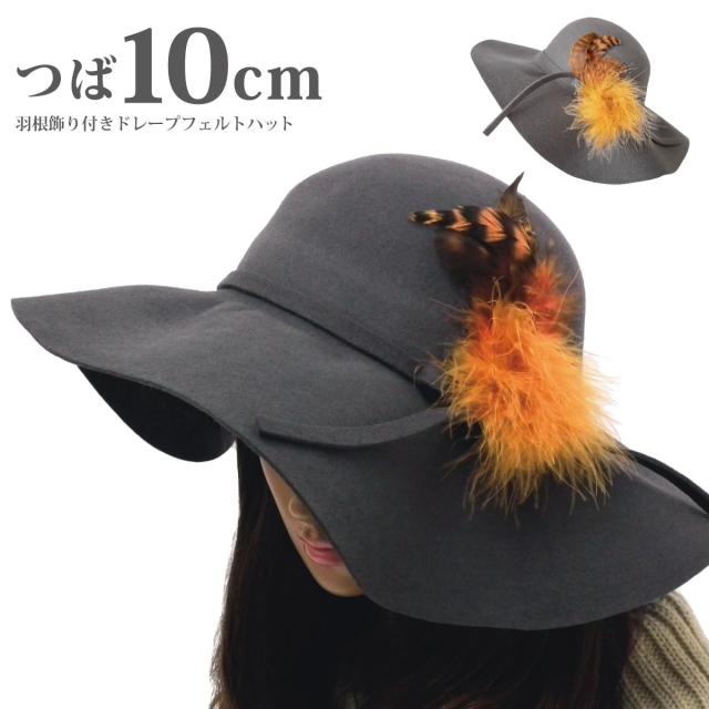女優帽 つば長 フェルトハット 秋冬 ハット つば10cm ウール素材 羽根飾り ドレープ ハンドメイド hat-902 婦人 つば広 レディース 高級感 セレブ UV 日よけ 日傘帽 お洒落 エレガント 上品 無地 プレゼント