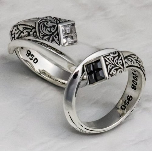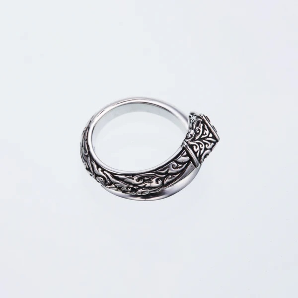 らせん状の先端にアイビー模様が掘り込まれ、美しく存在感あるスクエアカットのホワイトジルコニアを使用した美しいリング。