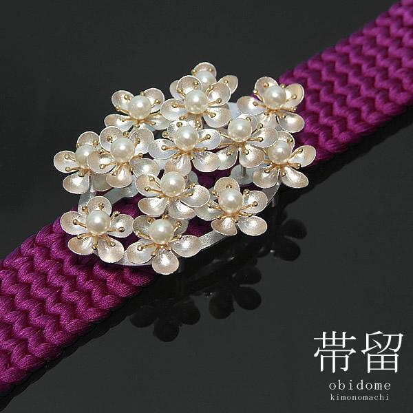 光沢あるシルバーの梅の花がたくさんついており、白いパールもキラキラと光るのでとても華やかな帯留です。