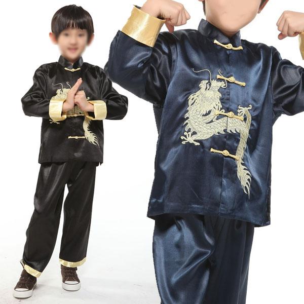 キッズ子供用サテン ドラゴン刺繍カンフースーツ 上下セット 長袖2〜6才(ネコポス便可)表演服,功夫,武術,衣装,太極拳