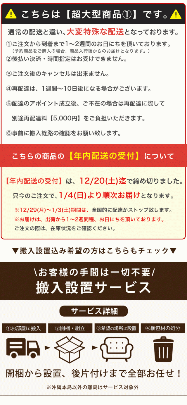 ※配送は全て宅配便(1人)での玄関渡しとなります。大型商品や重量商品、エレベーターの無い2階以上にお住まいのお客様は、玄関口までの搬入をお手伝いをお願いしております事をご了承ください。