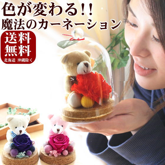 ≪送料無料≫大きさ:高さ13センチ 幅(直径)9センチ。お色は カーネーション全4色。この花(プリザ)にはもうひとつの魔法がかけられています。そっと吐息を吹きかけてみたり、冷気をあててみてください。温度によって色が変わるサプライズ!!≪北海道・沖縄への配送不可≫