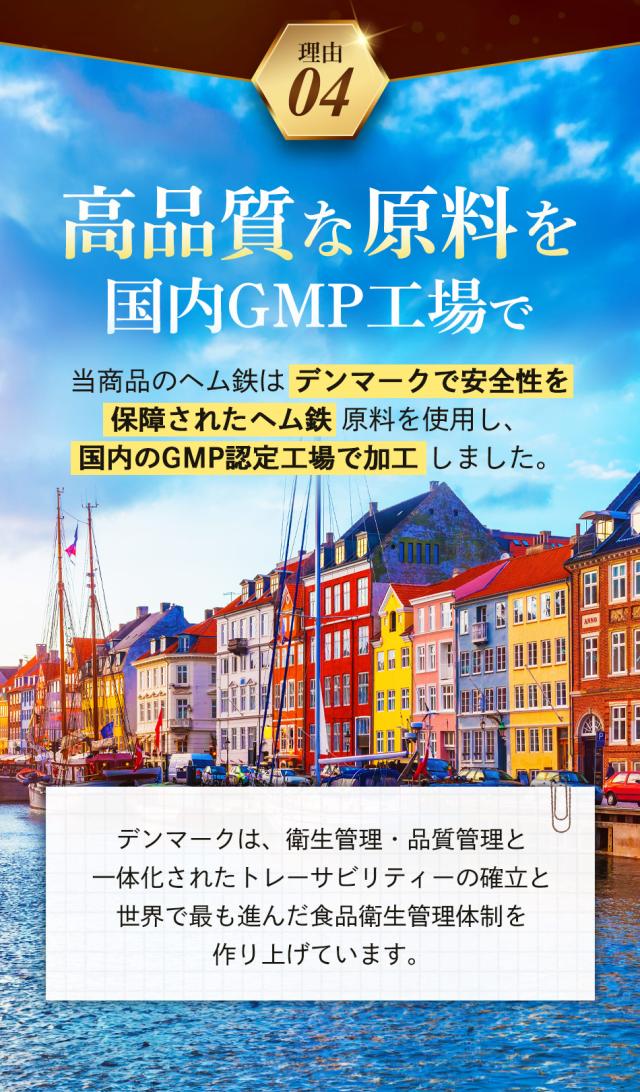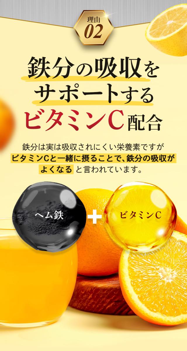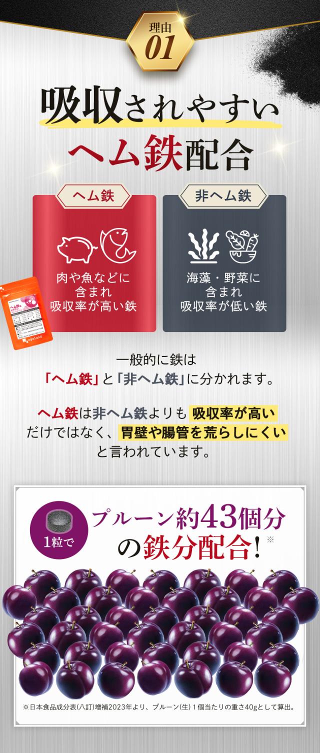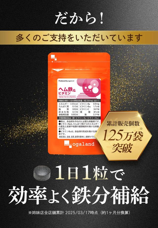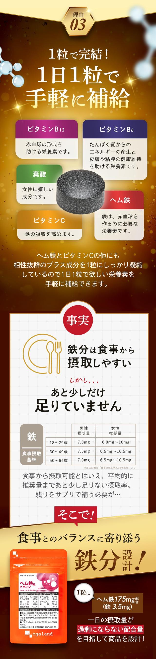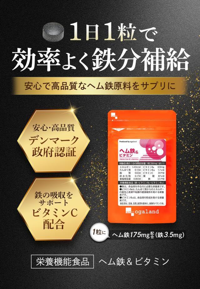 主要原料(1粒あたり):ヘム鉄 175mg(鉄として3.5mg) / ビタミンC 34mg / ビタミンB6 0.9mg / 葉酸 87μg / ビタミンB12 1.7μg