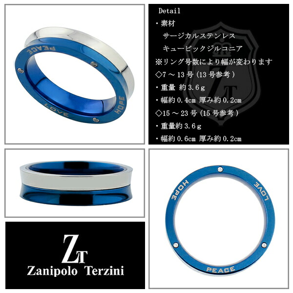 ザニポロタルツィーニ ツートーンカラー サージカルステンレスリング 7〜23号HOPE PEACE LOVE 〜希望 平和 愛〜 男性用 指輪