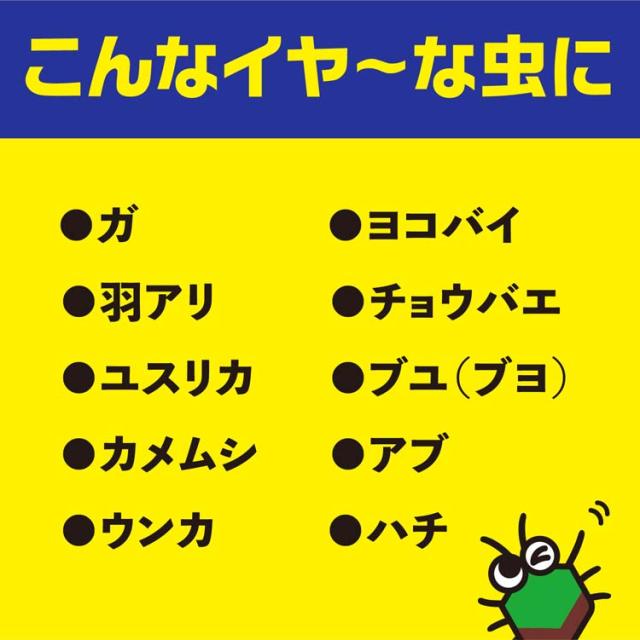 - いろいろな虫に効果あるようです。 蜂やカメムシやダンゴムシ、 よくいる小さい羽虫にも効いています。 近所で、売っているのを見かけないので口コミだけで判断して購入しましたが、当たりでした。