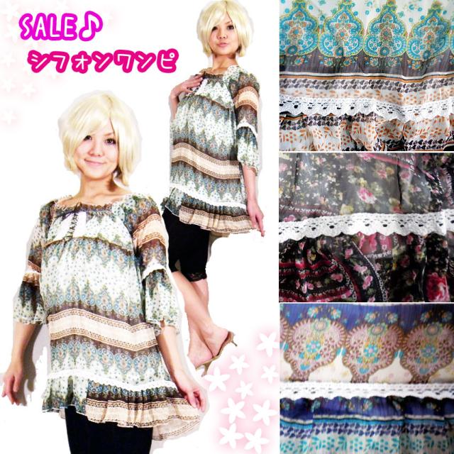 訳あり セール 最終 ワンピース SALE ペイズリー ローズ ガーデン ふんわり 姫袖 花柄 シフォン ワンピ チュニック タイプ体型カバー