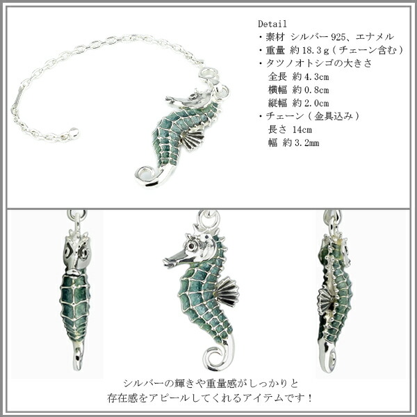 とぼけたようなタツノオトシゴの表情や、のんびり漂うような落ち着いた様子も魅力的な、ワンポイントアクセサリーです。