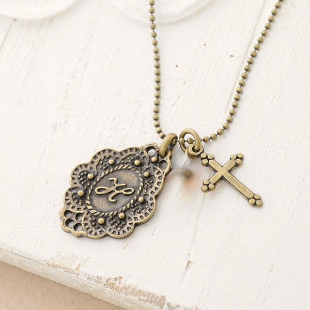 ハンドメイド ロザリオ ペンダント アンティークメタル イニシャル「H」 ゴールドカラー C b15 クロス 十字架