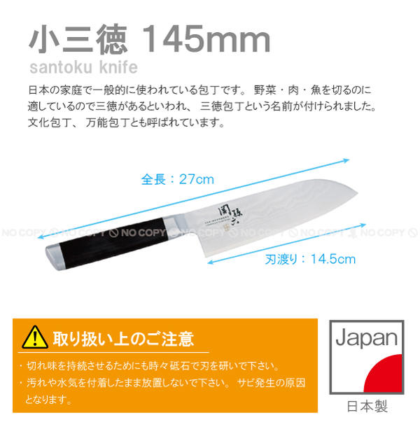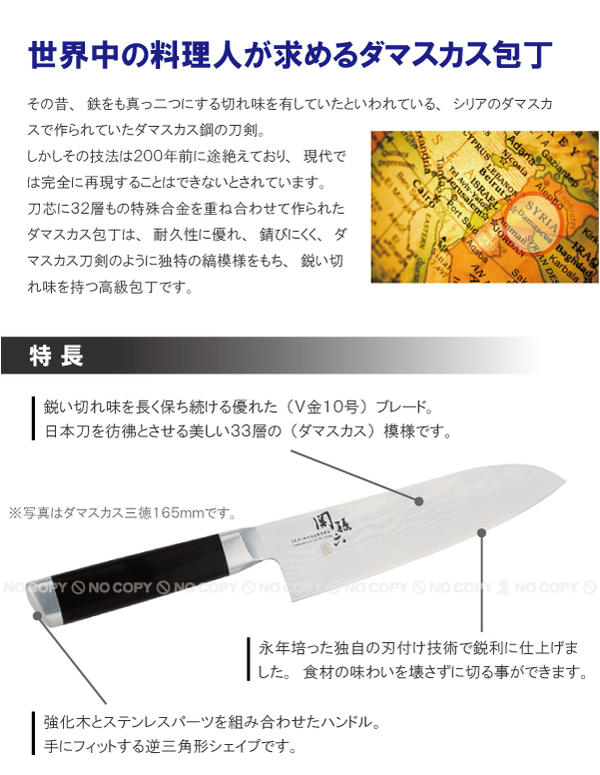 関の刀剣が「折れず曲がらず、よく切れる」と称賛された信念を受け継ぎ、匠の技やその切れ味を現代に伝えている【関孫六】。ダマスカスシリーズはステンレスを33層に折り重ねて鍛造したダマスカス鋼と呼ばれる高級材を使用、切れ味・使い心地・デザイン性という機能美を追求した関孫六の最上位シリーズです。日本刀のような鋭い切れ味とともにひとつひとつ異なる美しい波紋をお楽しみください。三徳包丁は野菜切り・肉切り魚のさばきなど、様々な調理で活躍する日本が生んだ万能包丁です。※この商品は日本製です。