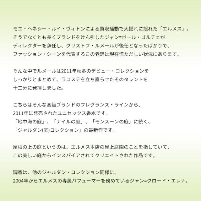 調香は、他のジャルダン・コレクション同様に、2004年からエルメスの専属パフューマーを務めているジャン=クロード・エレナ。基本的にはフルーティー・グリーンの香りでポップなたたずまいですが、ラストのコンポスト(堆肥)のブレンドが非常にシックなテイストを帯びていて、通り一遍のライト・フレグランスにならないところがさすがです。ほかのマテリアルも高品質ですので、幅広い年齢層の方にお使いいただけると思います。ボックスの綺麗なイラストは、エルメス本店の屋上庭園を描いたものです。