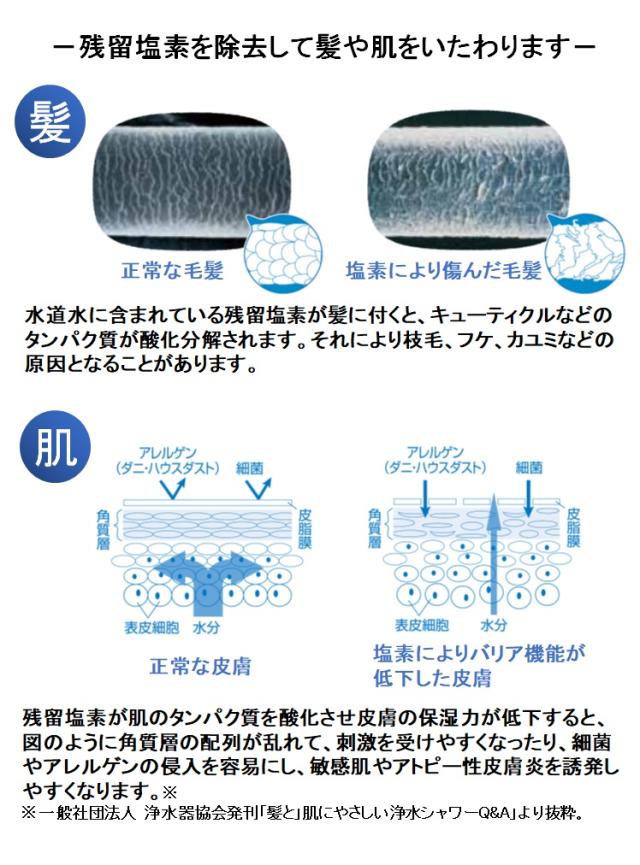 ●活性炭ろ材が肌や髪にダメージをあたえる残留塩素をしっかり除去。