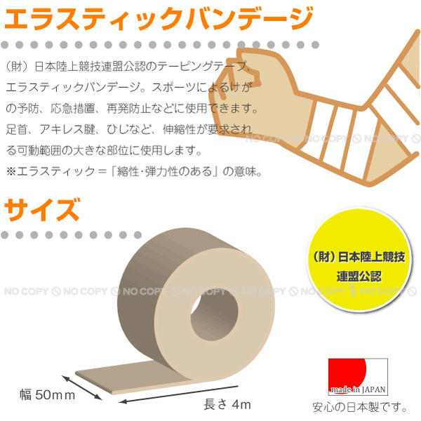 (財)日本陸上競技連盟公認のテーピングテープ、エラスティックバンデージ。スポーツによるけがの予防、応急措置、再発防止などに使用できます。足首、アキレス腱、ひじなど、伸縮性が要求される可動範囲の大きな部位に使用します。 ※本商品は日本製です。
