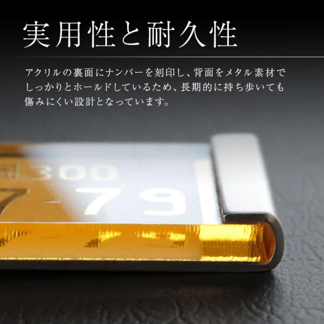 | \ 本物のナンバープレートを忠実に再現! / あなたの愛車のナンバーを刻印いたします。 オンリーワンのキーリングだから これ以上にない特別感。 大人の方へのギフトに喜ばれる 高級感あふれるナンバープレートキーホルダーです。 1. 高級感抜群のアクリルミラー エレガント ゴージャス な ゴールド クールモダンな シルバー 輝きを放つキーホルダーは、注目されること間違いなし。 だから、男性にも好まれやすく、目上の方にもぴったり。 高級感だけではなく、耐久性も追求しました。 アクリルの裏面にナンバーを刻印いたしますので、 擦れて文字が消えてしまう心配もありません。 背面はメタルで覆ってあるので、強度もバッチリ。 鏡面がアクリル越しに見えることで、 ギラギラしすぎず、落ち着きのある色合いになっています。 角度によって光沢が変化し、そのたびに色んな表情を見せてくれる 味わい深さのあるキーホルダーです。 愛着を持って永くお使いいただけます。 2. 本物そっくりそのまんま! ナンバーのレイアウトは、 ・ 自動車用 ・ バイク用 ・ 記念日用 とそれぞれご用意してありますので、 実物のナンバープレートを忠実に再現した使用になっております。 まるで ミニチュア のような かわいさ。 「本物そっくり」「リアル」なクオリティにご満足いただけたと、 たくさんの嬉しい反響をいただいております。 ぜひ実物を手にしていただき、その感動を味わって下さい! 3. 名前入り ・お好きな数字も可能♪ 「記念日用」をご選択いただければ、 お好きな文字をお入れすることが出来ます。 2人の名前を彫刻してペア キーホルダー としてお使いの方、 家族 で おそろい にしてお使いいただいている方も。 “ナンバープレート”は思い入れのある数字を選んでいる方も少なくありません。 だからこそもらったら絶対にうれしいプレゼント。 「こんなのあるんだ〜!」というサプライズをお届け。 さらにこの「ナンバープレートキーホルダー ミラー」なら他とは違う高級感。 お渡しするお相手に、きっと笑顔になってもらえるギフトです♪ [ ご利用シーンなど ] 男性にはもちろん女性にも 車 マイカー 単車 バイク が大好きなあの人へ… バレンタイン 父の日 敬老の日 バースデープレゼント 新車祝い 新車購入記念 納車祝い ご成約プレゼントに。 お父さん 旦那さん 彼氏 に誕生日プレゼントに キーケース とセットで、など 様々な 記念日に。 40代 50代 60代 お父さん 運転手 ドライバー の方 に 思いを込めて 交通安全 のお守りに、とお渡しいただくのもおすすめです。 |