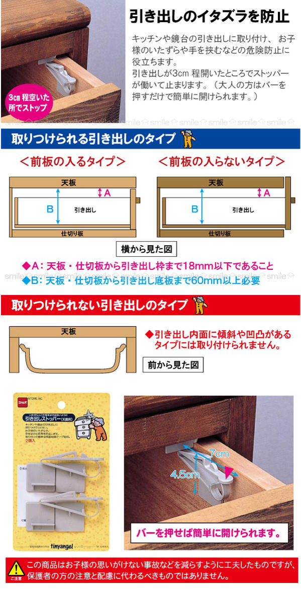 キッチンや鏡台の引き出しに取り付けお子様のいたずらや、手をはさむなどの危険防止に役立ちます。引き出しが3mm程開いたところでストッパーが働いて止まります。大人の方はバーを押すだけで簡単に開けられます。