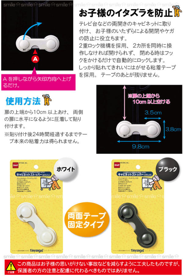 テレビ台などの両開きのキャビネットに取り付けてお子様のイタズラによる開閉の防止に役立ちます。ガラス以外の両開き扉にも使用可能です。大人の方には押すだけで開けられて閉める時は、フックをかけるだけで自動的にロックしてくれます。