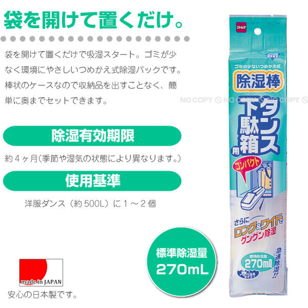 袋を開けて置くだけで除湿スタート。ゴミが少なく環境にやさしいつめかえ式除湿パックです。棒状のケースなので収納品を出すことなく、簡単に奥までセットできます。 ※本商品は日本製です。