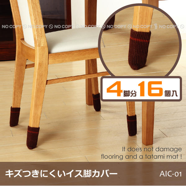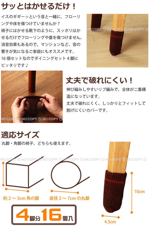 イスのギギーッという音と一緒に、フローリングや床を傷つけていませんか? 椅子にはかせる靴下のように、スッポリはかせるだけでフローリングや畳を傷つけません。消音効果もあるので、マンションなど、音の響きが気になるご家庭にもオススメです。伸び縮みしやすいリブ編みで、全体が二重構造になっています。16個セットでダイニングセット4脚にピッタリ♪ 丸脚・角脚の椅子、どちらも使えます。
