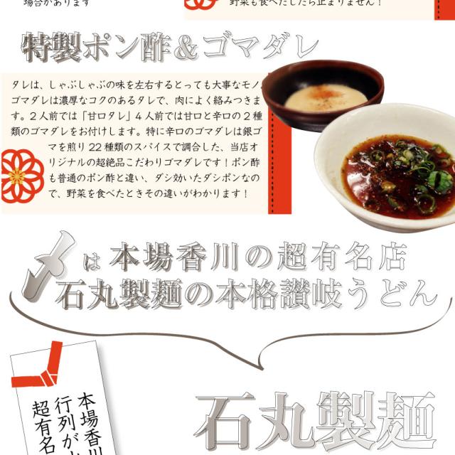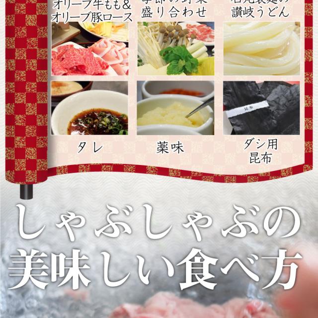 | 内容量 | オリーブ牛150g、オリーブ豚150g、野菜盛り合わせ、タレ2種類、しゃぶもち4枚、だし用真昆布 2g、石丸製麺讃岐うどん220g |