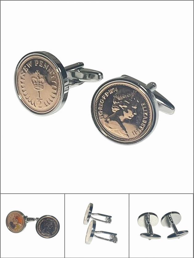 このカフスボタンは、実際の英国ハーフペンス硬貨を使用しており、