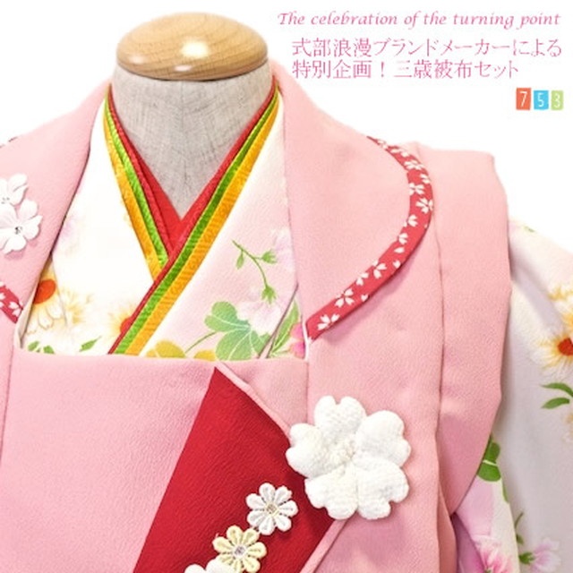 ラインストーンが煌めくの三歳女児七五三被布着物セット。