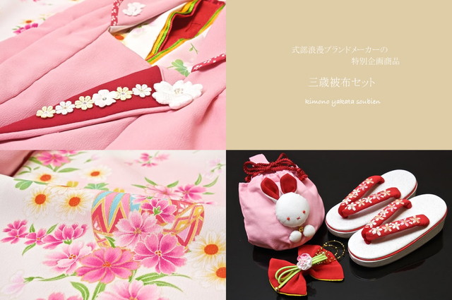 セット内容は【着物・長襦袢・被布コート・巾着・髪飾り・草履】です。