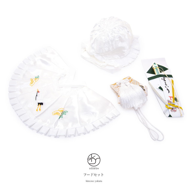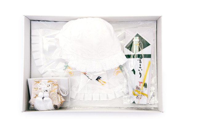 セットには、フード・よだれかけ・お守り袋・ 末広(扇子)が入っています。