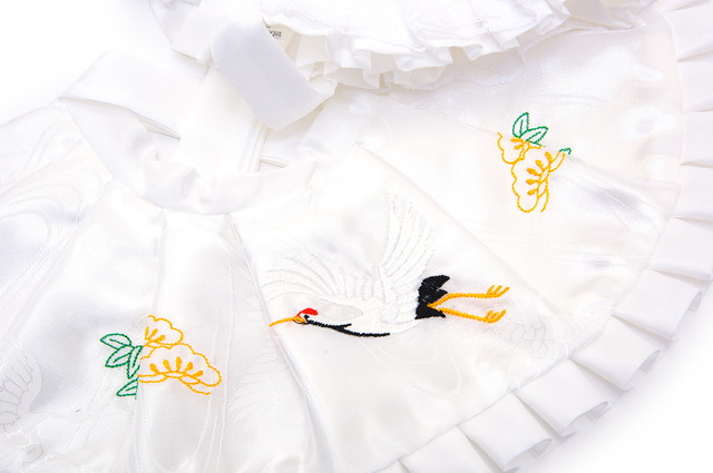 フード・よだれかけには、鶴の地模様があり、よだれかけには、刺繍が施されています。