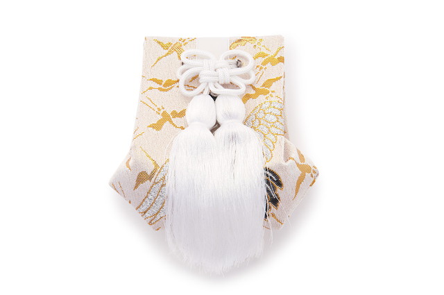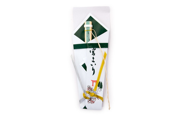 お宮参りの際、お守りと扇子は、初着の紐部分に吊します。