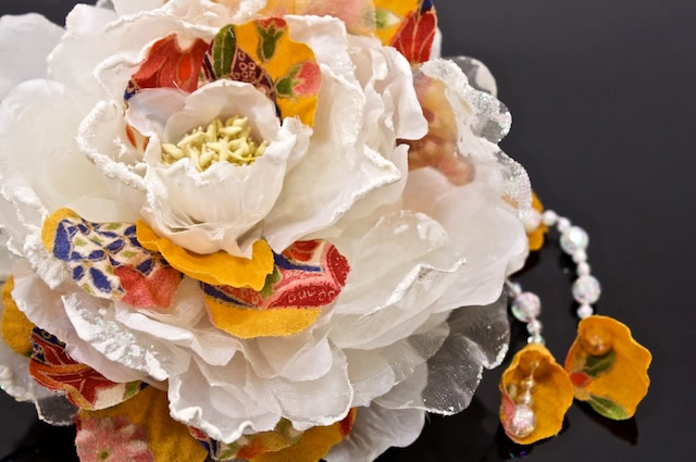 オフしろの花びらと和柄の花びらを幾重にも重ね合わせたお花飾り。