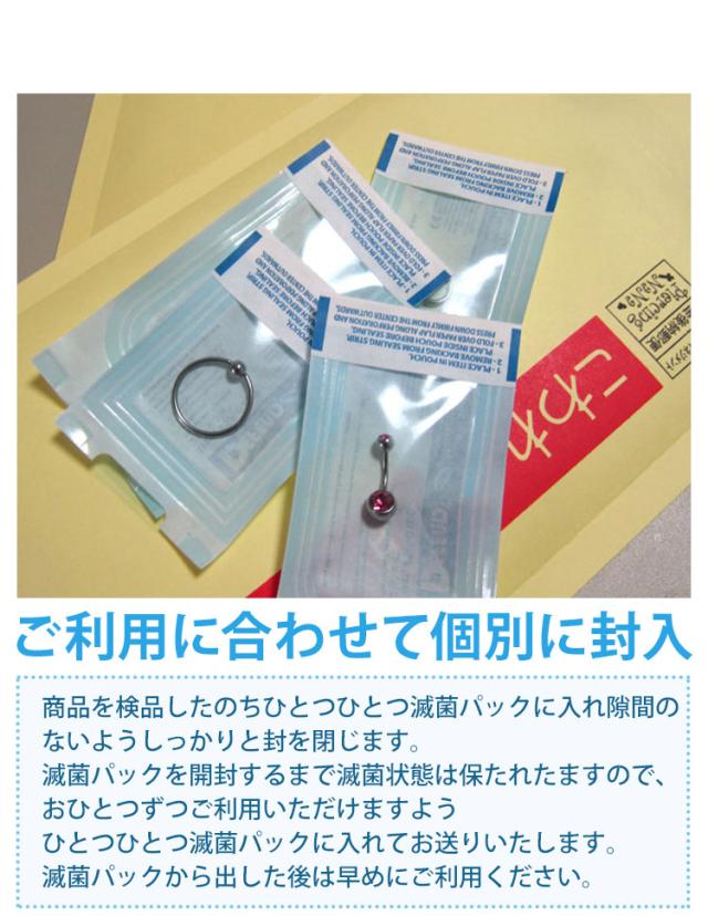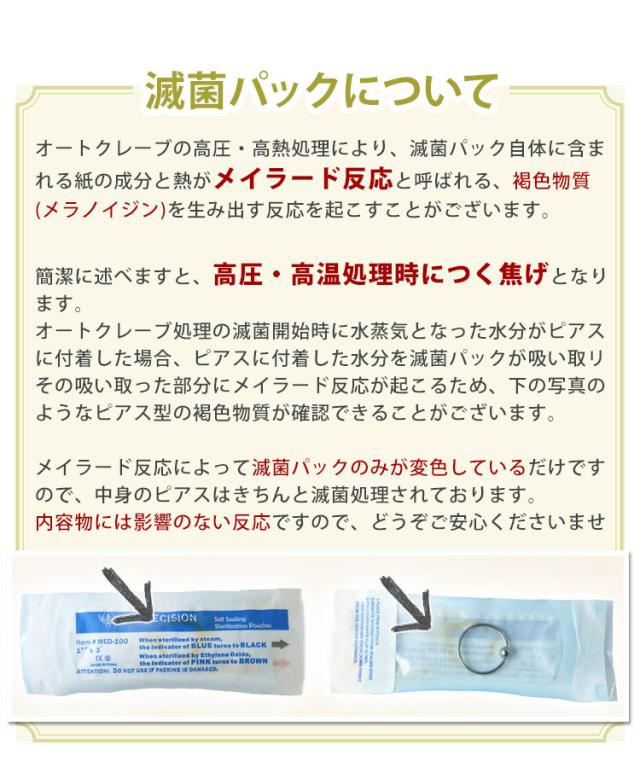 ご注文いただきましたピアスをオートクレーブを使用し、高圧高熱の蒸気にて滅菌処理を行います。以下注意事項をご確認のうえ、ピアスと同梱にてご注文ください。1回のご注文につき滅菌が可能なピアスをすべてひとつひとつ滅菌パックに入れてお送りいたします。