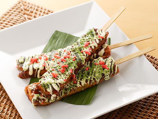 かつおだし風味の利いた生地に、キャベツとねぎを入れてふんわり焼き上げたスティック状のお好み焼きを串にしました。