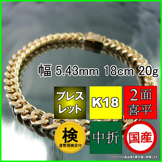 18金 18k 喜平 ブレスレット 20g 18cm 2面 幅5.4mm 造幣局検定付 K18 アンクレット 喜平ネックレス 日本製 チェーン メンズ レディース アクセサリー 中折 国産 金 K18 キヘイ ゴールド イエローゴールド kihei 二面 プレゼント グラム 誕生日 贈り物 ギフト