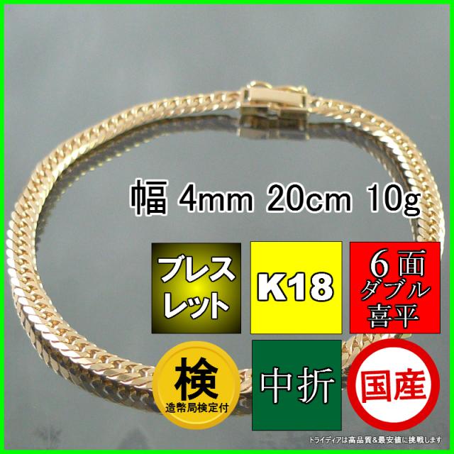 18金 18k 喜平 ブレスレット 10g 20cm 6面 ダブル 造幣局検定付 幅4mm K18 アンクレット 喜平ネックレス 日本製 6面ダブル チェーン メンズ レディース アクセサリー 中折 国産 金 K18 ゴールド イエローゴールド キヘイ kihei プレゼント グラム 誕生日 ギフト