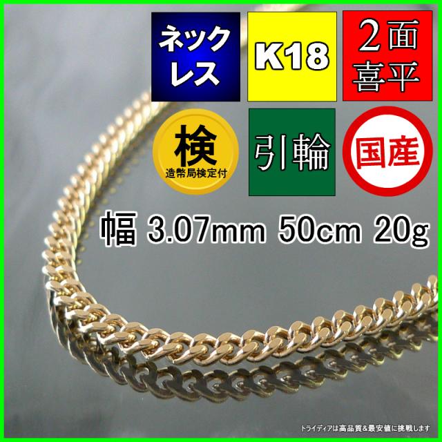 18金 18k 喜平 ネックレス 20g 50cm 2面 幅3mm 造幣局検定付 K18 喜平ネックレス 日本製 チェーン メンズ レディース アクセサリー 引輪 国産 金 K18 キヘイ ゴールド イエローゴールド kihei 二面 プレゼント グラム 誕生日 贈り物 ギフト