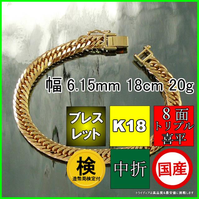 18金 喜平 ブレスレット 20g 18cm 8面 トリプル 造幣局検定付 幅6.1mm K18 喜平ネックレス ゴールド イエローゴールド 日本製 8面トリプル チェーン レディース アクセサリー 中折 国産 金 K18 キヘイ kihei 八面 プレゼント 誕生日 贈り物 ギフト