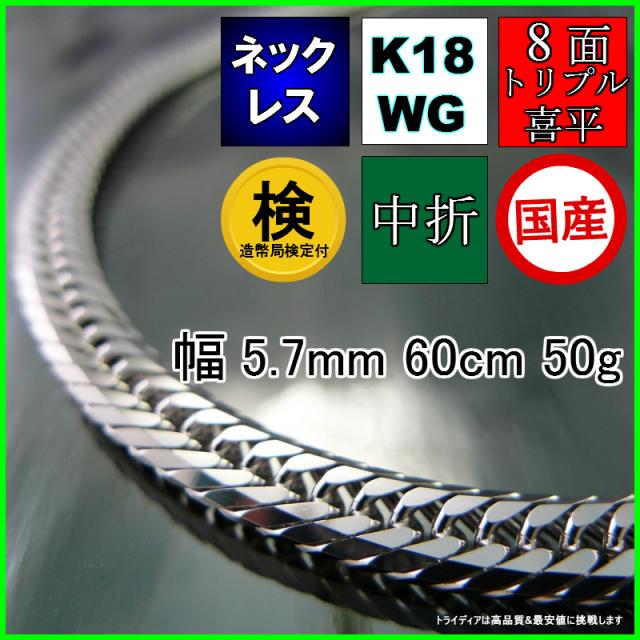 18金 ホワイトゴールド 喜平 ネックレス 50g 60cm 8面 トリプル 造幣局検定付 幅5.7mm K18WG 喜平ネックレス 日本製 8面トリプル チェーン メンズ レディース アクセサリー 中折 国産 金 K18 WG キヘイ kihei 八面 プレゼント グラム 誕生日 贈り物 ギフト