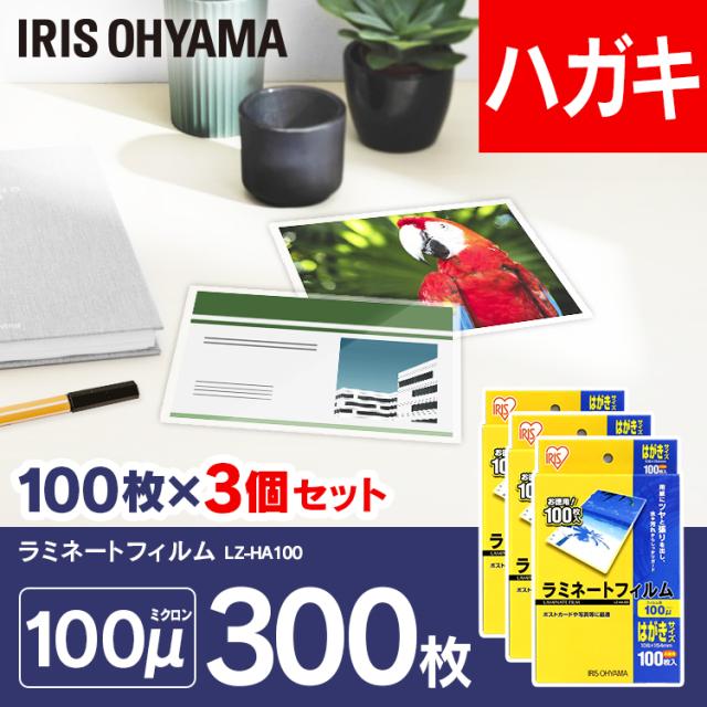 ラミネートフィルム はがきサイズ 3個セット 300枚 100枚入り 100マイクロメートル 100枚×3 フィルム 図面 ポスター 写真 メニュー表 耐水性 透明度 LZ-HA100 アイリスオーヤマ