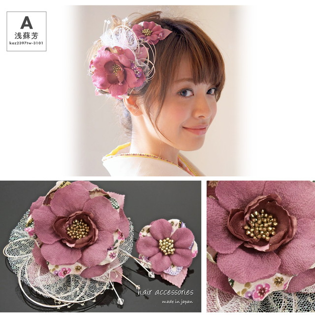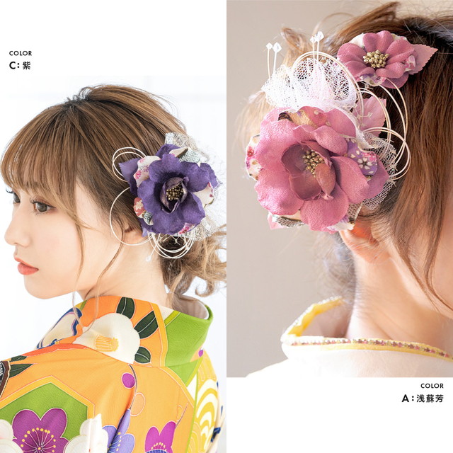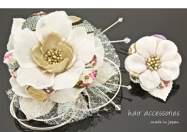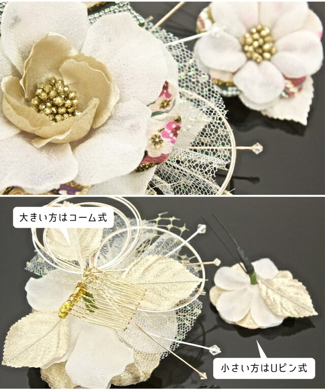 お花髪飾りの大小2つがセットになったヘアアクセセットです。